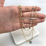 18K Gold Layered Oro Laminado Beaded Pearls Evil Eyes Charms Chain, Oval Link Chain and Bead Ball Link Chain with Evil Eyes Charm, 03 Layers Lucky and Protection Necklace 71.1083/6-15